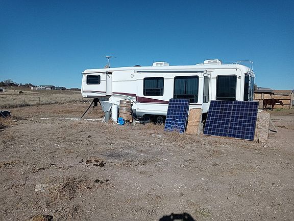 This is a 5 acre parcel that is totally fenced with 3 corrals and 3 covered horse run-ins. We have added a 550 gallon water tank to the property. Construction is almost complete on the 450 sq ft garage with roofing being installed this week. Construction for a 2500 sq ft home is also in progress with the footers dug. Building plans for this house are included; all county fees are paid and up to date. There is a 550 gallon water tank on the property with connections to the corral and trailer. The 38 Ft 5th wheel trailer is also included with the property; it is setup with solar power. This property is move in ready while you build your dream home! We will consider all financing options and offers. Please contact Karen at 714-215-6688 or email me @ kbazrn@gmail.com.