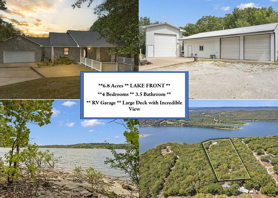 Motivated Seller!! Welcome to your dream lakefront estate on the picturesque Table Rock Lake in Golden, Missouri! This 6.6-acre property offers the perfect blend of privacy, space, and lakefront living. As you approach, you'll be impressed by the private driveway that leads to this well-appointed estate. The first thing you'll notice is the extra-large two-car garage, complete with a spacious attached workshop featuring a full bath--ideal for any hobbyist or craftsman. A full-length carport extends out back, providing additional covered parking or storage.Further down the drive, you'll find a massive RV shed, perfect for storing your recreational vehicles, boats, or outdoor equipment. Finally, you'll arrive at the heart of the estate--the main residence. The home itself boasts a stunning rocked exterior and a beautiful concrete patio, offering an inviting entrance. The attached two-car garage ensures ample parking and convenience.Step inside to discover vaulted ceilings that add a sense of grandeur to the living spaces. Patio doors open to a back deck, creating a seamless flow between indoor and outdoor living spaces. The deck offers a serene spot to relax and enjoy breathtaking views of Table Rock Lake, just a short walk away.This well-built home has served as a cherished family estate and is now ready for its next chapter. With its own water well and septic system, it offers self-sufficient living in a tranquil, natural setting. Whether you're seeking a lakefront retreat, a place to host family gatherings, or a permanent residence, this property has it all. Don't miss your chance to own a piece of paradise on Table Rock Lake!