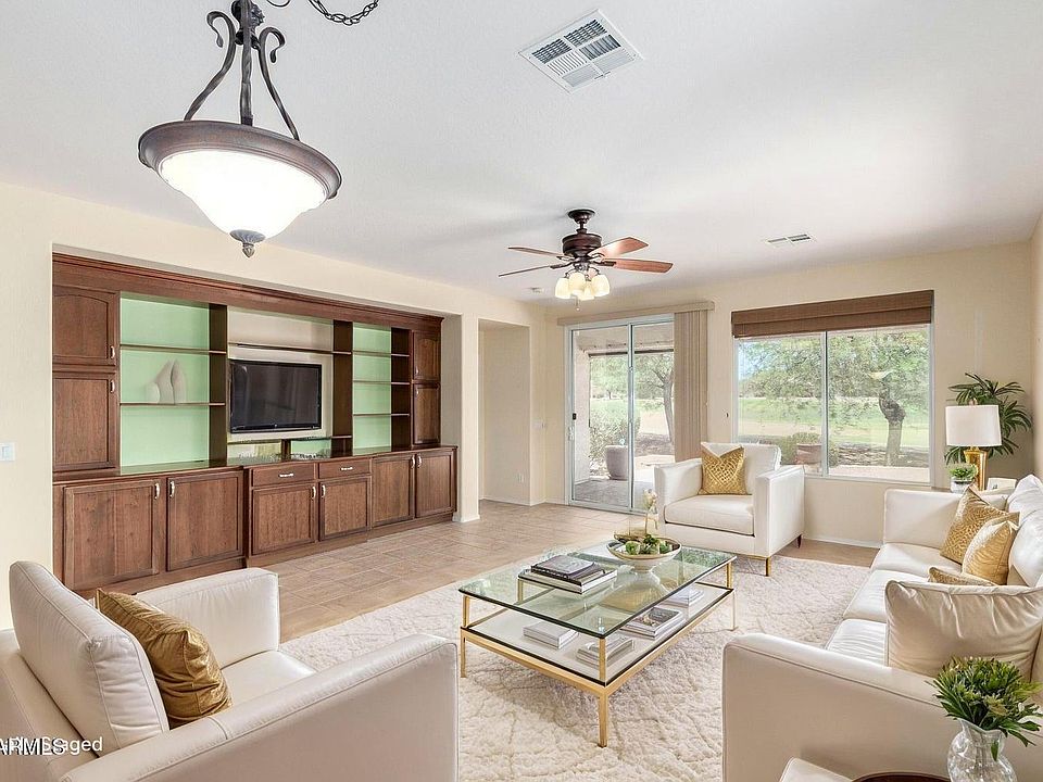 SOLAR OWNED! Experience resort-style living on the 10th Fairway in this highly desirable active adult community! This beautifully maintained 2-bedroom plus den, 1.75-bath home offers the perfect blend of comfort, functionality, and elegant design. Step inside to an open floor plan featuring vaulted ceilings, neutral tones, and ceramic tile flooring throughout. The spacious great room is filled with natural light, complemented by custom window treatments and a modern aesthetic. The chef's kitchen is ideal for entertaining, showcasing custom cabinetry with pull-out shelves, built-in appliances (refrigerator, oven, microwave, and dishwasher), and a movable island for added versatility. The primary suite offers plush carpeting and sweeping views of the 10th fairway. SOLAR OWNED!