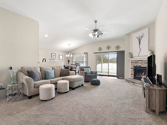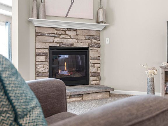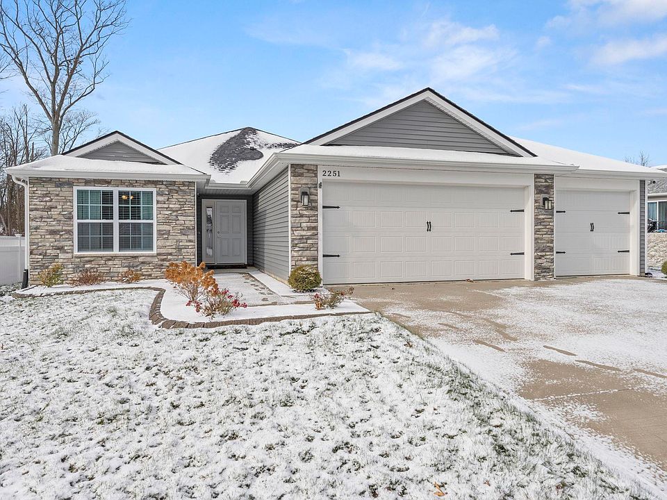 OPEN HOUSE Sunday, 1/29 12-2pm. Fall in love at the front door with this beautiful 2 year old 3 bedroom and 2 full bathroom ranch home on a slab with a 3 car garage and views to a pond and woods to the rear! The wonderful curb appeal welcomes you as there is concrete edging around the front landscape beds. Step inside and you will be comfortable in the large Great Room with 10' ceilings, a corner gas log fireplace and stone surround, open to the kitchen, and an oversized 8' patio door to the rear. The 14x11 Kitchen looks into the great room, has quartz countertops, appliances which remain, and a walk-in pantry. The master suite offers a trey ceiling, bathroom with 10' ceilings featuring Luxury vinyl plank flooring, quartz countertops on the 36" high double-sink vanity that provides an abundance of counterspace and drawers. Bedroom 2 is set off near the second full bathroom, and the third bedroom is just off the foyer and has french doors and can be an office/bedroom. The covered 22x8 back patio will provide maintenance-free outdoor living space. The 3 car garage has a pull-down ladder to floored attic storage space, and deep stall at the 3rd bay. Notable features include several security cameras, blinds on all of the windows, and remote control ceiling fans in the great room and master bedroom. Additionally the setting of Stratford Forest is beautiful; a natural setting near country properties but minutes to US 30, I-69, shopping, restaurants, and top-rated schools. Average Utilities Gas $58/m., Electric $58/m., City Water/Sewer/ Trash $70/m.