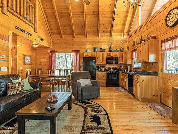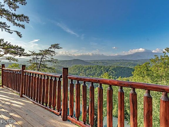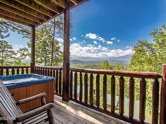 This renovated, fully furnished turnkey 4 br/3ba mountain retreat is one of the highest cabins in the resort, offering unparalleled views of the Great Smoky Mountains from every level. The spacious great room boasts a soaring cathedral ceiling, expansive windows that flood the space with natural light, a cozy stone fireplace, and beautiful hardwood floors. The main and upper levels each include a spacious bedroom and a full bathroom, while the lower level offers two additional bedrooms, a full bathroom, and an entertainment-packed game room complete with arcade games, foosball, an electronic dart board, and a pool table. After a day of adventures, unwind in the private hot tub overlooking the mountains. Each of the three levels features its own private deck, providing serene outdoor spaces to soak in the breathtaking scenery. This stunning turnkey mountain cabin retreat comfortably sleeps 9 and is located approximately 5 miles from Dollywood. It is nestled in the heart of the Smokies while still in close proximity to many of the beloved attractions, restaurants, and shopping the area has to offer.