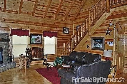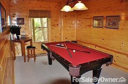 Upon entering this beautiful Smoky Mountain cabin you will notice the attention to detail and the decorative touches. The living room has high-beamed ceilings and large fixed glass windows to take in lots of natural light. There is a leather sofa (sleeper), loveseat and a two person rocking chair all gathered around the gas fireplace. The kitchen is fully equipped with cooking and eating utensils. There is also seating at the dining table for eight. When the weather permits and your family needs more room the back deck offers a picnic table and lots of rocking chairs. Located off the living area is a bedroom with a King log bed and TV with satellite. There is a full bath accessible by both the bedroom and the living area. The hall closet has a stack washer and dryer. Upstairs is a private bedroom with high ceilings a Queen bed, rocking chair and a TV with a DVD player. The full bathroom has a jetted tub. At the foot of the stairs on the lower level is the game room complete with a full size pool table, TV with satellite and a cocktail table with bar stools. There are two private bedrooms and a full bath that is accessed from the bedrooms and the game room. The bedroom with the Queen bed, TV with a DVD player has a door leading to the Hot tub on the deck. The other bedroom has a King bed and a TV with a DVD. For added convenience for parents with a small child there is a futon located at the foot of the bed. This log cabin with a western motif would make even a rancher in hard times feel at ease. Our cabin is on a rental program now and can be seen at http://www.vrbo.com/622426. Look under 4 bedroom cabins for "Horsin Around". Amenities Include: Satellite TV Central Heat and Air Coffee Maker Dishwasher Full Kitchen Gas Fireplace Indoor Jacuzzi Microwave Non Smoking Pool Table Secure Gated Community Wooded/Mountain Views CD Player Charcoal Grill Dart Board DVD Game Room Hot Tub Iron Additional property info: http://www.forsalebyowner.com/listing/4-bed-Log-Cabin-Home-for-sale-by-owner-2251-Upper-Middle-Creek-Road-37876/22795196?provider_id=28079