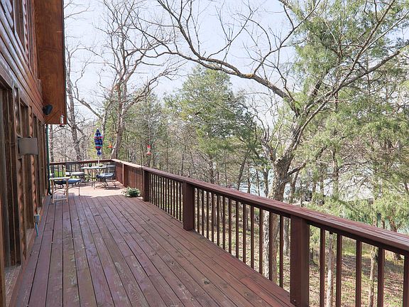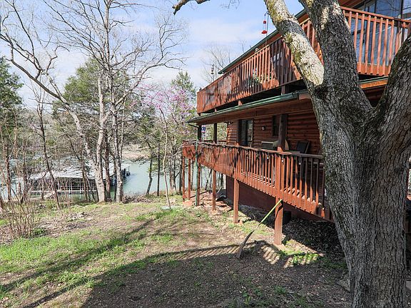 Welcome home to 22512 Air Park Drive overlooking the gorgeous Table Rock Lake. Tucked in Air Park Beach subdivision, this log cabin offers quiet lake living at its finest. Wrap around deck and dock within walking distance complete this setting. Home features an open floor plan for family space, bedroom and laundry room on the main level and amazing windows on the lakeside. Additional beds and baths are upstairs with a private upper deck and loft area. Detached garage offers a full apartment with kitchen, dining and living room area. This space has a private deck overlooking the lake as well.