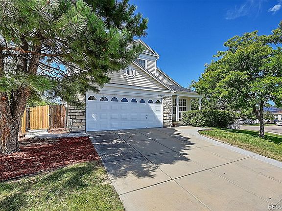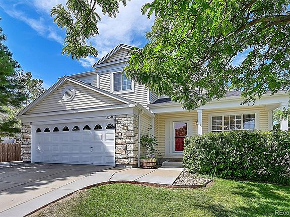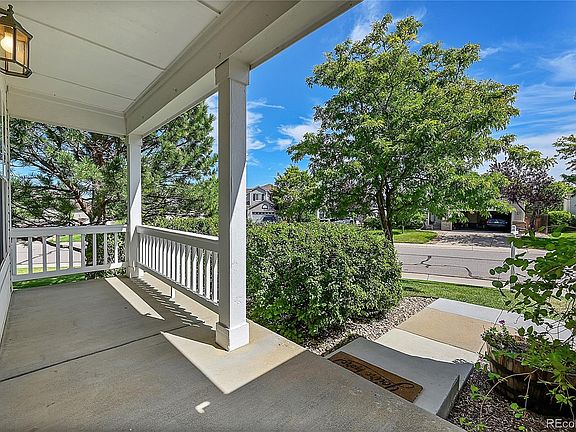 WOW, beautiful two-story home on one of Saddle Rock Ridge's larger corner lots! Home stands out, situated on a quarter of an acre with a gorgeous fully-fenced backyard, an amazing 38'11"x17'8" stamped patio with fire pit & lets not forget about all the beautiful trees (18+) in the backyard which provides privacy.This wonderful, very clean, home is like new with new carpet & pad, new paint, and new refinished hardwood floors. Upon entry, you'll find a very open floor plan with a vaulted ceiling in the formal living room & dining room perfect for entertaining & holiday gatherings. The family room has a stone surround gas fireplace with upgraded wall beadboard and mantel.The fireplace provides great ambiance & for relaxing on chillier days/nights. The kitchen boasts Brazilian granite counters, stainless-steel appliances, a custom backsplash, 42" upper cabinets, pull-out drawers, a center island, a double door large pantry, and a dedicated eating space. The 1/2 bath on the main level has tile floor, wainscoting, solid surface counter with undermount sink & upgraded fixtures. The laundry room is on the main level & has upper cabinets & wall shelving. Upstairs, you'll find a primary bedroom with a cathedral ceiling & ceiling fan, 2 closets and a 5-piece primary bath with soaking tub, updated tile, updated shower fixtures which include 2 shower heads and a separate shower wand as well as a frameless shower door. There are 3 additional bedrooms with ceiling fans in each room which share a full bath with tile flooring, solid surface counter with undermount sink & upgraded light fixture. The finished partial basement hosts a large recreation/media room with closet and daylight windows. You could also have a portion of the daylight finished basement as a bedroom if you need more than 4 bedrooms. Great neighborhood in the desirable Cherry Creek School District, close to Southlands Mall, restaurants and easy access to E-470!