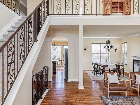 Luminous interiors inspire a coveted escape in this custom design Saddle Rock residence. Situated on the golf course, a lush and idyllic setting envelops a welcoming exterior. Further inside, ornate details flow throughout an open layout flanked by hardwood flooring and lofty ceilings. An expansive living area extends into an elegant dining space with an eye-catching chandelier. Arched doorways lead into a kitchen boasting generous cabinetry and a center island with a beverage refrigerator. Enjoy late morning brunch while seated in a bright breakfast nook. Retreat to a primary suite with a tray ceiling and cozy seating area. A spa-like bath promotes rest and relaxation with a glass-enclosed shower, large jetted soaking tub and double vanities. Two secondary bedrooms afford space flexible to new residents’ needs. Entertainers delight in a finished basement with a large rec room boasting a wet bar plus a furnished theater room and ample storage. Warm up with the radiant flooring throughout. Enjoy leisurely relaxation outdoors on a vast patio showcasing golf course views. Video and audio surveillance in the home.