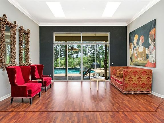 Sky lights, huge windows, sliding glass doors and 12 foot ceilings bring the outside in. Located in Windermere in 24 hour guard gated Waterford Pointe, an exclusive community of 118 homes, is this spacious, single story, 4 bed, 3.5 bath, 3309 sq. ft. pool home on 1.2 acres tucked away in a park-like setting with preserve as the backdrop. Wrought iron fencing encompasses an oversized backyard where 12 majestic oaks maximize your perfect outdoor lifestyle allowing you to enjoy nature all day as the trees provide a canopy of shade and beauty. Views of the large lanai, sparkling pool and gorgeous backyard are enjoyed from nearly every room. The kitchen, breakfast area and large family room blend seamlessly to form a spacious, gathering space. A jack and jill bath connects two bedrooms. The 4th bedroom is currently used as an office. Large sliding doors off the master give easy access to the peaceful pool and backyard. A Michael Graves soaking tub is the focal point of the master bath, a beautiful honey onyx stone counter compliments one of the vanities, space is organized in the custom closet and a large walk in shower completes the master bath. Out front, a large circular drive provides ample parking along with more towering oaks. Residents enjoy private access to Lake Roberts, a 116 acre lake where residents ski, canoe, fish or relax on the dock, and the community tennis court, park and community building. Centrally located near major roadways, attractions and excellent restaurants.