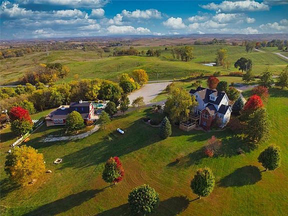 ESCAPE to this Stunning Country Estate on 20 rolling acs! Beautiful, well-maintained home & income potential w/ newly remodeled "barn" wedding event venue. Could be winery, B&B, retreat space, guest quarters - limited only by your imagination. The tree-lined driveway leads to your peaceful haven w/5 fireplaces, gourmet kitchen, tiered deck, media room & more. Step outside to million dollar views, orchard, vineyard, pecan grove, meadows & timber for hunting. Just outside of historic Weston MO. Must see to believe!! Located in award winning West Platte School District. Property has county special use permits for B & B and event venue that stay w/ property. Buyers should contact Platte Cnty P&Z to verify allowable uses. Only 27 min to Kansas City International Airport, 33 min to St. Joseph, MO.
