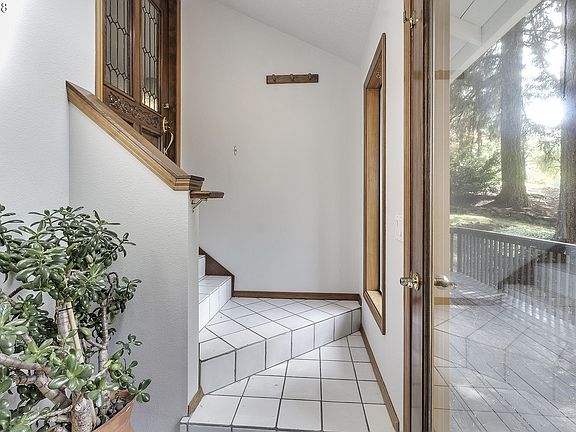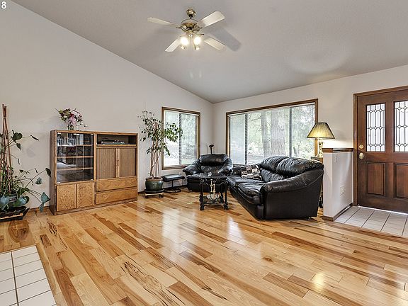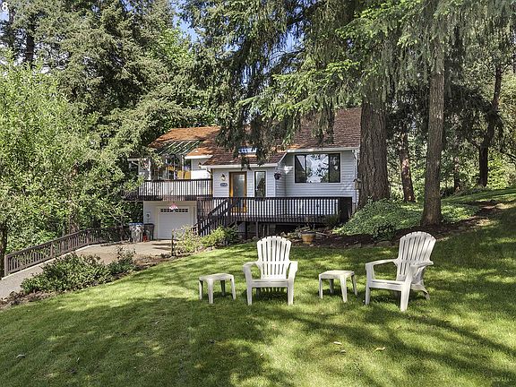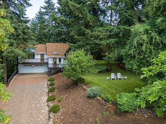 Recent appraisal $575,000. Contemporary nestled on a private 1.2 acre lot!Vaulted ceilings, Hickory Floors & two sided wood burning fireplace featured in the living & master. Tastefully designed kitchen boasts a wall of windows,island w/breakfast bar & glass door out to deck. Great for entertaining! Main flr master suite w/door out to deck w/hot tub. Parklike setting w/ walking trails. Easy access to 1-5 & 20 min to OHSU.