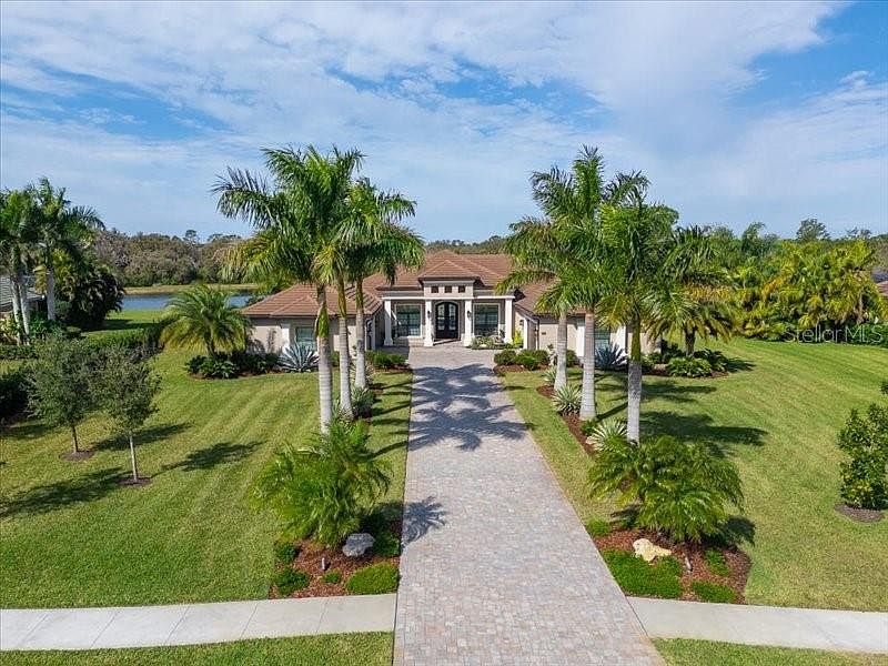 There is a framed picture hanging in the hallway to the Primary bedroom which showcases the words to the song," Never My Love," by The Association. The homeowner gave that print to his wife as a gift. It tells another story, the story of the love and care that they poured into this home which they built together. Meticulous planning and attention to every detail resulted in the most breathtaking home. Nestled in the Panther Ridge community of Florida, this custom-built upscale home, built by Johnson Builders, epitomizes luxury living at its finest. Boasting a meticulously crafted design and an array of high-end features, this residence offers unparalleled comfort and style. Key Features:4 bedrooms with a split floor plan for added privacy. 3 elegant bathrooms. Inviting saltwater pool, perfect for relaxation and entertainment. Spacious 4-car garage for ample parking and storage Soaring 10 ft to 14 ft ceilings adorned with custom crown molding. Stunning hickory wood floors throughout the living areas. Exquisite custom handcrafted iron front door. Hurricane impact windows and doors for added peace of mind. Open-concept layout ideal for modern living. Gourmet Kitchen: Large quartzite island, perfect for culinary creations and gatherings. Premium KitchenAid appliances and induction cooktop, expansive pantry for convenient storage, ample storage under the island and throughout the kitchen in custom wood cabinets with soft close. Living room features pocket sliders, automatic shades, and coffered ceiling. Dining room boasts custom built-ins, plantation shutters and a custom light made by Hubbardton Forge. Thoughtfully designed home office with built-ins, plantation shutters, and French doors provides a perfect spot for all your work from home needs. Welcome Center and Laundry: Granite counters and custom cabinets in the welcome center. Laundry room equipped with wide plank tile floors and ample storage space, walk in closet for extra storage, holds the home audio, visual equipment. Tranquil primary bedroom with tray ceilings, two spacious walk-in closets with custom built ins, ensuite bathroom with double vanity, soaking tub, and walk-in shower. Quartz counters and modern fixtures. At the end of the day you can sit and enjoy tranquil views of the pond and sunsets on the back lanai with panoramic picture screen and travertine decking, wood ceilings, fans, and outdoor TV for alfresco enjoyment. Air-conditioned storage closet for pool equipment. Refreshing saltwater pool with waterfall feature and charming backyard pergola. Lush landscaping designed by the homeowner, framing the property with beauty and symmetry. Additional Features: Whole house reverse osmosis water system and instant hot water. Serene 1.25-acre lot with king palms lining the long paved driveway. Conveniently located near golf courses, University Town Center, shopping, dining, and Sarasota's pristine beaches. Experience the epitome of luxury living in this Panther Ridge paradise. "You ask me if there will come a time when you grow tired of this home.....Never My Love."
