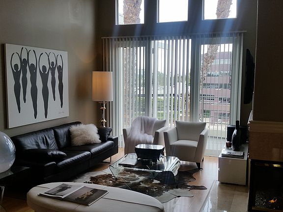 Resort style living at the guard gated Metropolitan in Irvine. This highly upgraded Penthouse is the best 1 bedroom floor plan in the complex with 13’ high soaring ceilings. Master bedroom and bath includes a shower and an oval bathtub, dual sinks with tile counters and a large walk in closet. There is also a spacious office or den off of entry. Spacious living room/dining area with corner fireplace. This property only shares one common wall and has a very nice private balcony with super views. The kitchen has granite counters and comes with a stainless steel refrigerator and washer/dryer. The flooring is top quality wood laminate. The Metropolitan offers a guarded entrance, beautiful tropical landscape, a large pool, very spacious spa, clubhouse and fitness center. This unit comes with 2 parking spaces!!