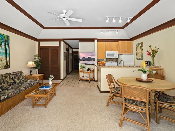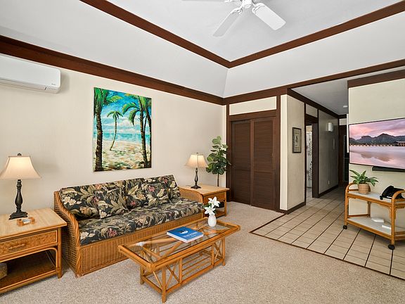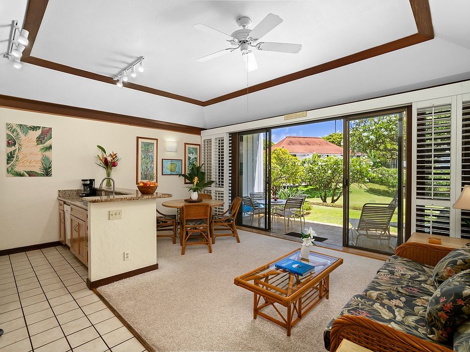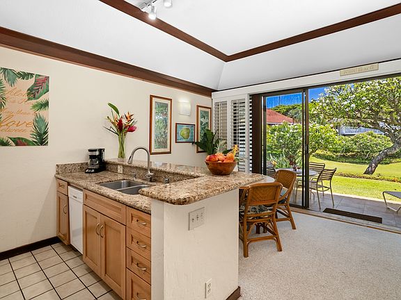 This is a leasehold property. Kiahuna Plantation unit 58 is perhaps one of best opportunities for a second home that allows you to use as a vacation rental. This unit is already a popular vacation rental, has been renovated and is located in the very heart of the resort. This is a true ground floor unit, there are no entry stairs and the lanai opens up to a grass lawn. Located on top of a knoll with Plumeria Tree’s that shelter the lanai, you don’t even need shoes for the minute and half walk to the beach that this resort is on.