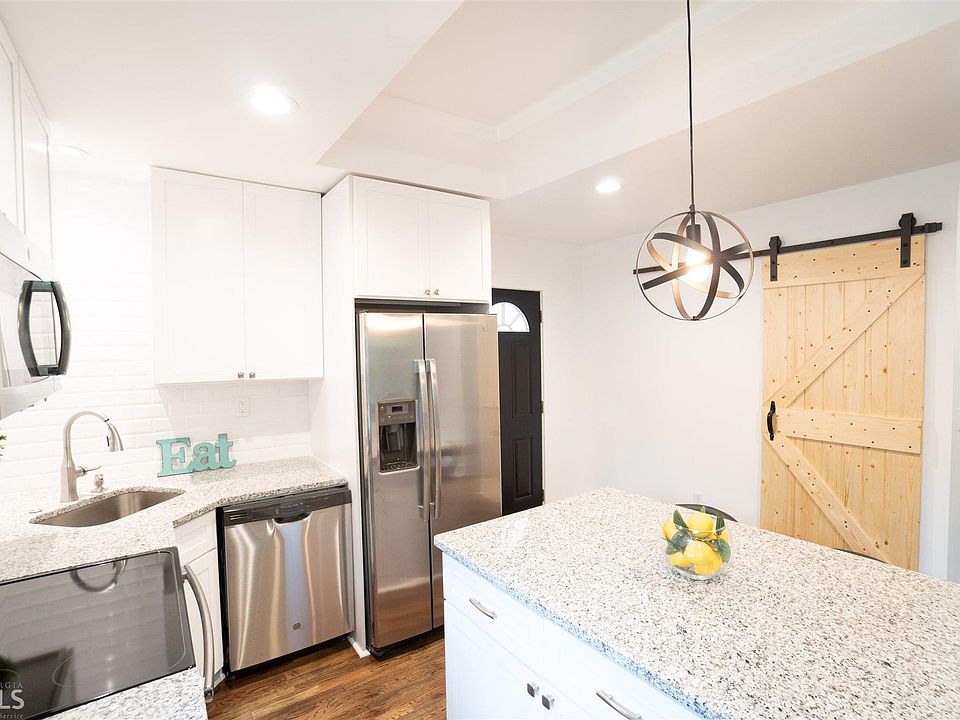 - Kitchen Features: Eat-in Kitchen, View to Family Room, Stone Counters, Kitchen Island, Cabinets Other, Cabinets White