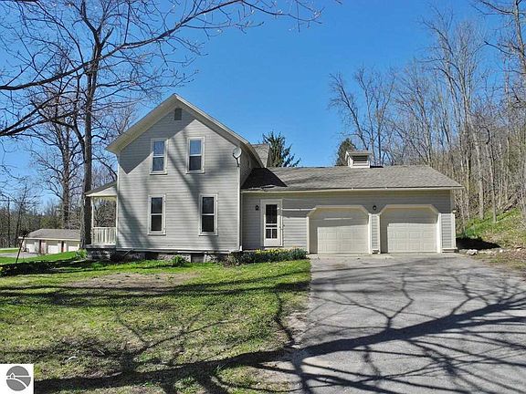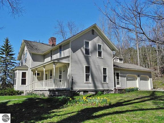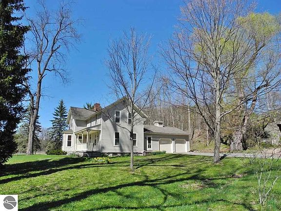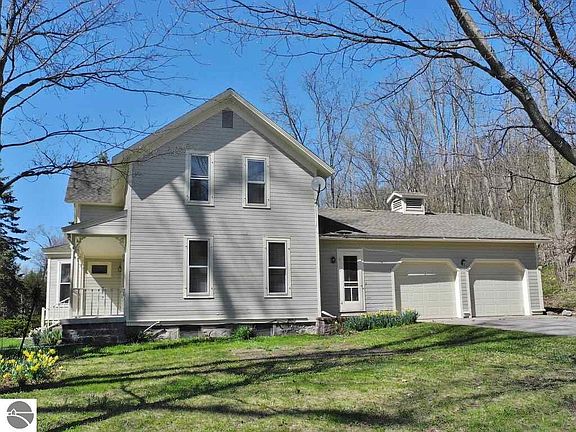 This charming and historic ~1880's farmhouse is located on a tranquil 4.84 acre parcel and features 2,040 sq. feet of finished living area, an inviting living room with a brick fireplace, 4 large bedrooms, 2 baths, hardwood flooring,basement, covered front porch, and attached 2 car finished garage. Wonderful outbuildings include a 3 car/1248 sqft detached garage/workshop, 720 sq. ft. granary building with loft, 200 sqft playhouse/shed, 2 story ~43'x81' barn with lean-to and shared small pond! Fantastic storybook countryside location adjacent to the Leelanau Bike Trail and conveniently situated between Suttons Bay & Traverse City on a paved county maintained road! Additional acreage available.
