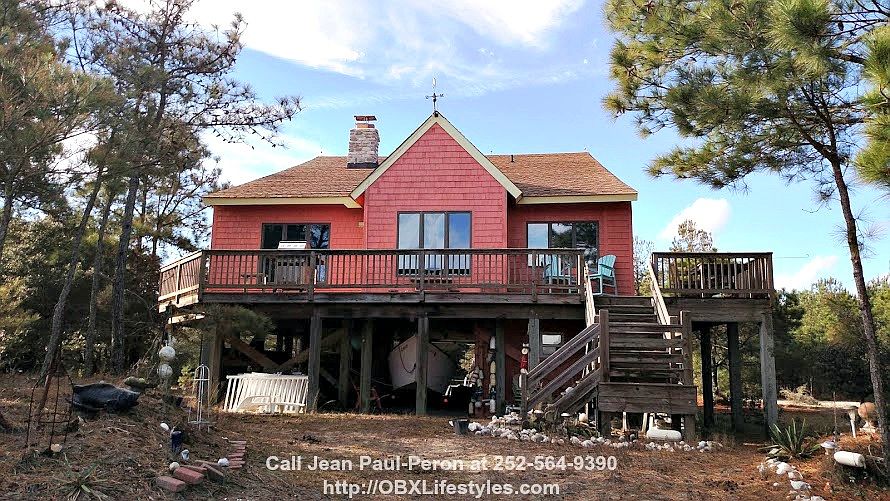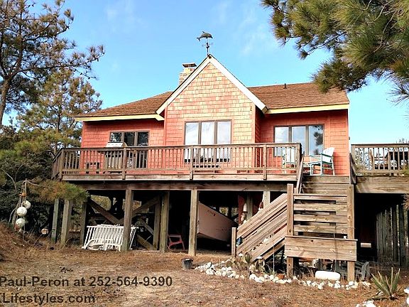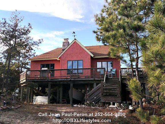 One of a kind Canal front house in Carova Beach. Built by Barry Nelms, this beach home offers a unique floor plan with 2 regular & 1 master bedroom on the main floor and an entire master suite upstairs complete with its own living area and large private deck. The property sits on the corner of the canal offering water views to the East and the South and behind mature trees giving it privacy from the road. There is room to park underneath and a dry entry to enter the house in bad weather. The main deck wraps around 3 sides of the house with steps leading down to the back yard. The main living area has vaulted ceilings with an exposed beam roof and a fireplace made with cobblestones from old streets in Virginia. For more information call The Listing Agent - Jean-Paul Peron at 252-564-9390.