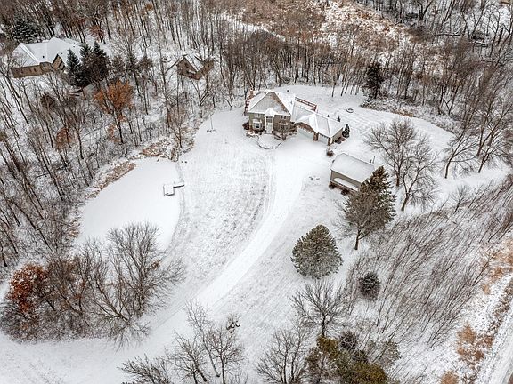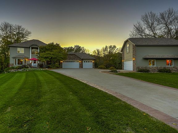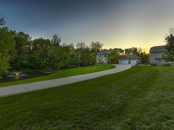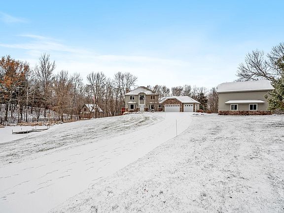 Nestled on 3 private acres with mature woods and a serene pond, this 4-bed, 4-bath two-story home boasts an oversized 3-car heated garage. The kitchen features newer stainless steel appliances, granite countertops, and hardwood floors. Open concept to the informal dining area and living room with a gas fireplace. Formal dining room showcases sophisticated leather flooring. Sunroom with vaulted ceilings leads to a spacious deck. Upper level with new carpeting, a master bedroom with gas fireplace, full private bath, and walk-in closet. Lower level is an entertainer's haven with a wet bar, billiards room, 4-season addition with heated floors, and family room walking out to a stamped concrete patio. Additional 46 x 28 outbuilding with a heated garage and bonus room above. Thoughtfully landscaped with boulder rock walls, perennial gardens, and a long private concrete driveway with stamped edging. Conveniently near I35 and Lakeville schools, this home seamlessly blends style and tranquility.