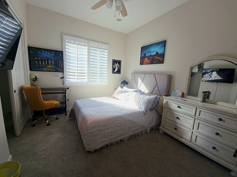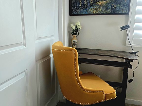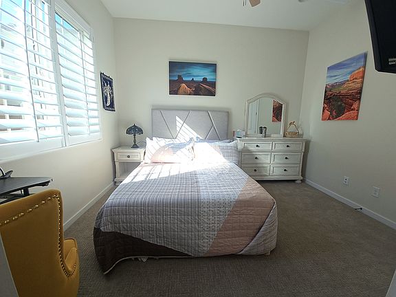 Room C features a cozy queen bed with a tufted headboard and vibrant bedding. Vintage nightstands with carved details and curved legs are paired with matching vintage-style lamps, each with a floral shade and crystal fringe, adding warmth and character. A mounted Smart TV offers easy access to streaming and entertainment. Nearby, a dedicated computer desk with a cheerful yellow swivel chair provides a comfortable spot for work or study. Shutters allow natural light and privacy. The room is finished with neutral carpet and coordinated decor.