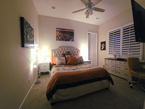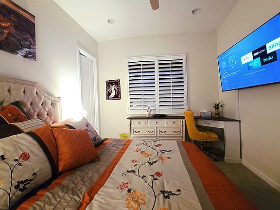Room B features a cozy queen bed with a tufted headboard and vibrant bedding. Vintage nightstands with carved details and curved legs are paired with matching vintage-style lamps, each with a floral shade and crystal fringe, adding warmth and character. A mounted Smart TV offers easy access to streaming and entertainment. Nearby, a dedicated computer desk with a cheerful yellow swivel chair provides a comfortable spot for work or study. Shutters allow natural light and privacy. The room is finished with neutral carpet and coordinated decor.