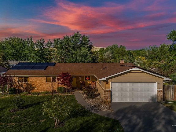Captivating single level home in coveted Warm Springs Mesa. Classic details with wood burning fireplace and hardwood floors. Updated kitchen with white cabinets and soft close deep drawers. Stainless steel appliances, granite counters, tile backsplash and breakfast bar. Primary suite has tile walk in shower, tile floors and updated vanity. Secondary bathroom features tub/shower with tile, tile floors, 2 sinks and updated vanity. North facing exterior features tile paver patio, pergola, shed, dog run, full fencing, sprinklers, potential RV parking, covered front porch, SOLAR PANELS and no HOA dues. Roof/windows/siding replaced 2008. Great location near river, foothills, greenbelt, lake, downtown, restaurants and more!