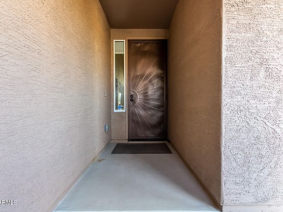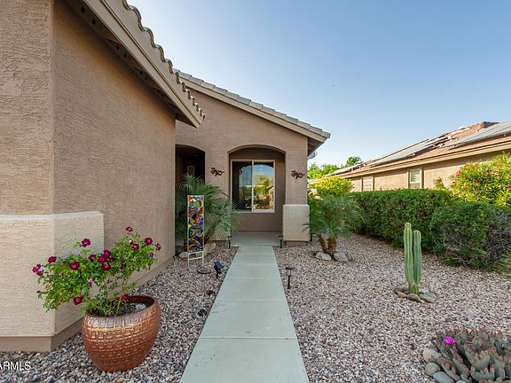 Make yourself at home in this incredible single-level home nestled on a golf course lot w/mountain view in the Adult Community of Sundance! This beauty displays a desert landscape, a 2-car garage, & a cozy front porch. Discover a semi-open floor design featuring tall ceilings, beautiful wood flooring, a sizable den for a study area, a media niche, bountiful natural light, & sliding glass doors to the back. Prepare meals in the impeccable kitchen equipped w/SS appliances, granite counters, mosaic tile backsplash, handsome wood cabinetry, a breakfast room, & a peninsula w/a breakfast bar. The carpeted main retreat has a private bathroom w/dual sinks, a separate tub, & a glass shower. Sit back & relax under the covered patio in the backyard w/built-in BBQ & an exterior fireplace. Must-see