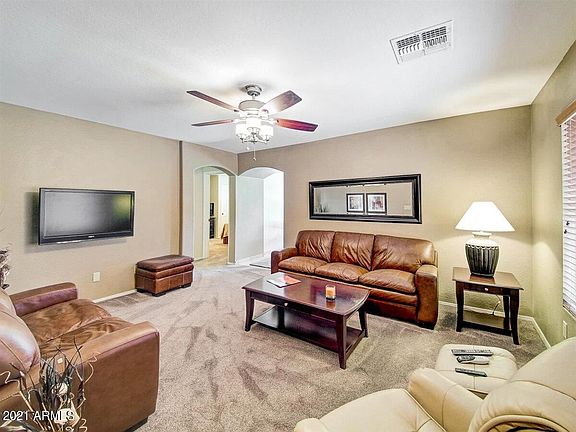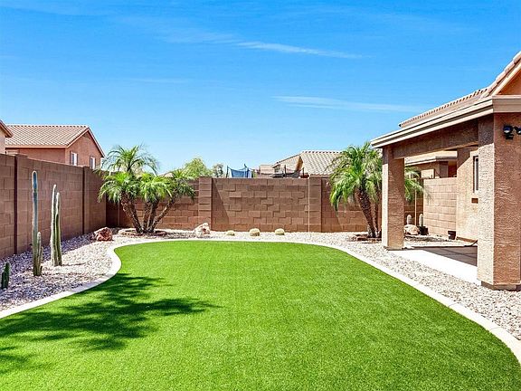 Impressive home with nice upgraded surprises. Golf course near by, home has tile and upgraded carpet, window blinds throughout, flat screen tv that is mounted on wall bracket stays. Appliances included: washer, driver, refrigerator, etc. Full bath was upgraded with tiled walk-in shower w/ glass door. Epoxy floor in garage & on the front walkway. There are hanging cabinets in garage, and nice paver walkway on east side of home leading to relaxing back yard, patio, must see to appreciate. Home has great curb appeal front & back, low maintenance, drip irrigation added for proper water management to the plants front & back. Back Turf area converted into synthetic grass back. North / South exposure. Home has lots to offer.