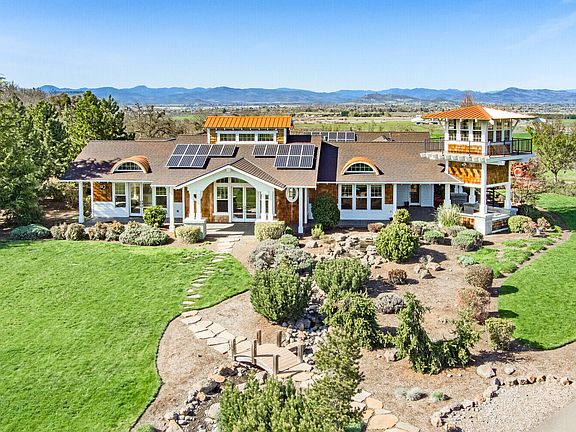 Incredible custom home with many recent upgrades on an 10.34 acre horse property with valley and mountain views. This light-filled nearly 4K sf home has four bedrooms, three bathrooms and a wonderful floor plan that invites indoor/outdoor living. The great room has vaulted ceilings, exposed beams, and connects to the internal courtyard - the perfect place for gatherings. The chef's kitchen has a large central island, granite countertops and stainless steel appliances. Patio has a built in kitchen perfect for entertaining outdoors. A lookout tower provides views of the Rogue Valley and can be used as a home office, art or exercise studio. The outdoor options are numerous with a 5 stall barn, 4 paddocks, 7 acres of irrigated hay fields, fully fenced property and farm infrastructure. With a solar array and Star Link internet, this home is both efficient and well-connected.