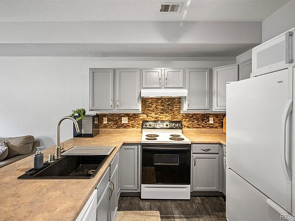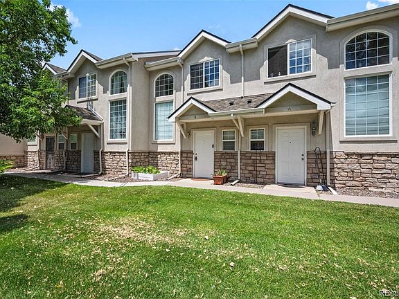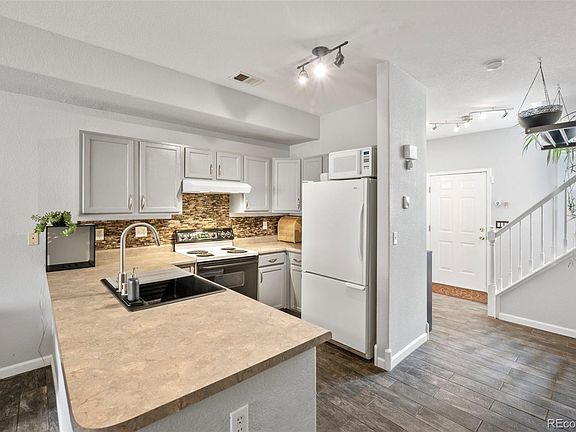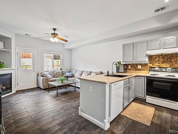 Come visit this well-kept townhome in Thornton's Balboa Park, ready & waiting for new owners! Affordability meets comfortability for anyone searching for the perfect home to call their own. On the main level you'll notice the open concept, with an accessible kitchen allowing for easy entertaining & a half bathroom for guests. All kitchen appliances are included, and a custom backsplash & deep kitchen sink have been added. Lots of light to enjoy in the living room, and the gas fireplace adds a bit of cozy during Colorado's colder months. On the stairs going up are custom cat ledges on the wall for feline friends to enjoy! Upstairs are the primary bedroom & second bedroom, which could be used as a home office or flex space as well. Worried about storage? No need! There are two full sized-closets, one under the stairs off the living room & a linen closet on the second floor. The unit garage faces the parking lot & includes an upper shelf for a bit more storage. Located near both Rotella Park and City View Park, plus minutes away from restaurants, I-25 and the lightrail. (Upgrades to this home include: BRAND NEW sinks in both bathrooms, Central AC, tile flooring & newer carpeting w/memory foam pad, newer baseboards, custom kitchen backsplash, extra deep kitchen sink, dual zone Smart thermostat, doorbell camera + 3 interior cameras, roller shades.)