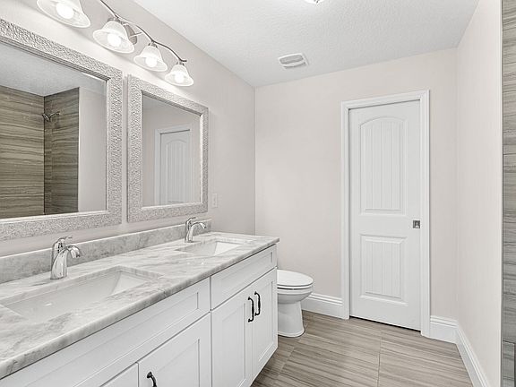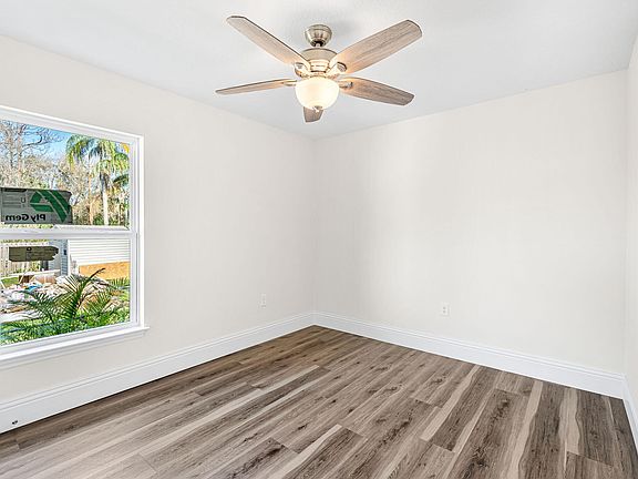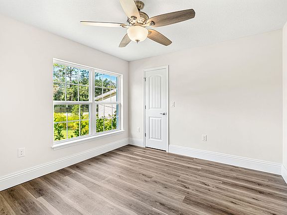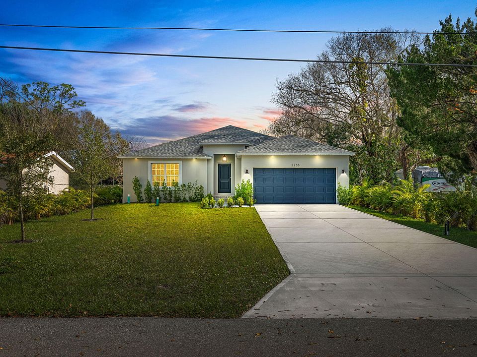 BRAND SPANKIN' NEW in a quiet country-like setting! This modern delight showcases beadboard-style doors, tray ceilings, luxury vinyl plank floors & contemporary finishes. The sunny, open plan features an expansive great rm coursing into spacious dining w/a triple slider to a breezy covered lanai overlooking a grassy backyard & tropical plants. Marbled stone counters & chic farmhouse lighting exhibit an island b-fast bar kitchen w/white cabinetry & sleek SS appliances. Relax in a comfortable primary retreat w/a walk-in closet, double stone sinks, a tiled shower & private water closet. A bdrm across the hall is ideal as an office or baby nursery. The adjacent bath flaunts a shower w/penny tile flooring. At the front of the home, 2 extra bdrms & a tub/shower bath w/dual stone sinks offer a perfect set-up for kids/guests. Situated next to the garage entry, the laundry rm is a handy drop-off spot for last-minute loads & sports gear. Close to schools, parks, shopping & I-95!