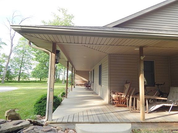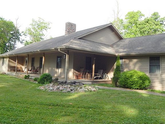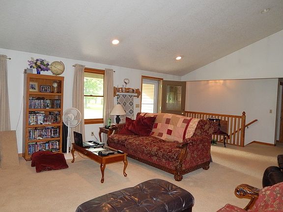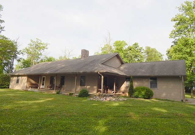 Private WOODED setting on 4.99 acres. Beautiful oak trim. Under counter lighting in kitchen. There is a small room off of kitchen that could be used as a pantry or small den. Very OPEN CONCEPT living space. Floor to ceiling stone FIREPLACE. Master suite has a very large walk-in closet, plus a separate closet, shower, and double sink vanity. Open stairway to basement in the great room. Finished basement is very open with a full bath and a wood stove. Separate entrance to basement from the garage. Andersen doors and windows. Pull down stairs to a floored attic in the garage. Covered front porch. 36x24 POLE BARN with concrete floor