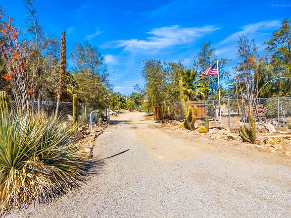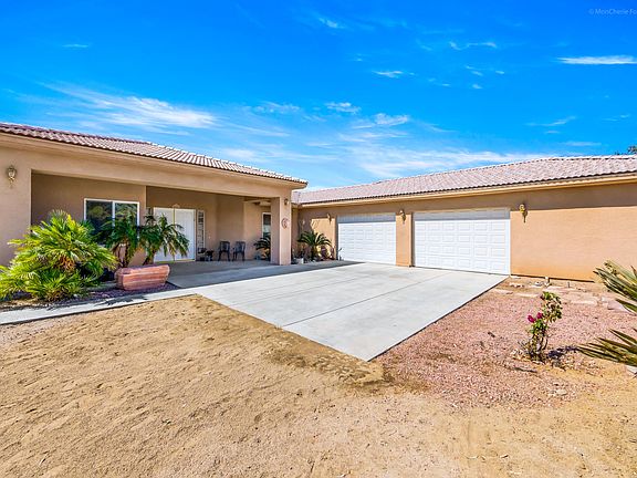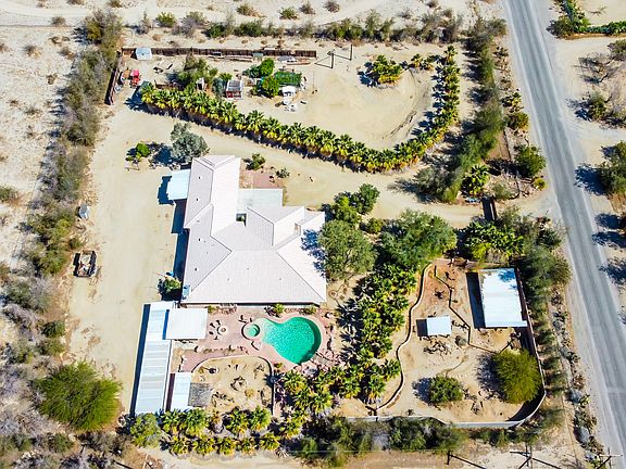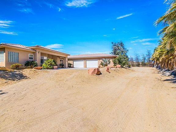 First time on the market, this beautiful desert estate boast pride of ownership. Escape on your very own 2.5 acre private desert oasis. Arrive at driveway lined with lush palm trees, property surrounded by mature desert landscaping on sprinkler system. Custom built home features over 2,800 sq ft split floor plan with 10ft ceilings, ceramic tile throughout and dual air conditioning zones, plus an additional 1,200 sq ft insulated covered patio. Enter home through double doors and be greeted at living room with inviting views to outdoors. Spacious kitchen offers plenty of natural light and amazing pool views. Large center island with lots of storage, granite tile countertops and electric range. Separate pantry, dry bar and eating area open to family room with massive fireplace. Big master bedroom suite offers spa-like feel ensuite with marble flooring, shower, dual vanities and walk-in closet. Enjoy your private mini-resort designed with tortoise sanctuary, waterfall pool and cascading spa. Covered outdoor grill, bar and fire pit area. Separate garden, swings and basketball hoop area. Oversized 1,200 sq ft 2-car+ working garage with pull through and air conditioner. Fine craftsmanship and quality, truly one of a kind property. No HOA. No Lease Land. Space for RV, ATV, Boat - bring the toys! Close distance to many attractions. 30 minutes from Palm Springs International Airport. 11 minutes to Coachella Valley Preserve Hiking Trails. Schedule your private showing today.