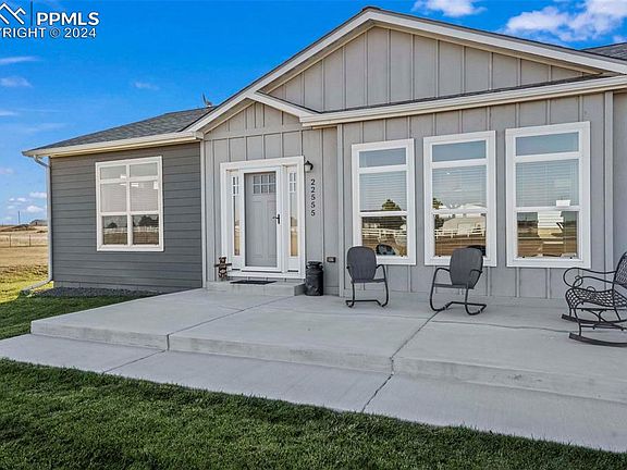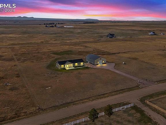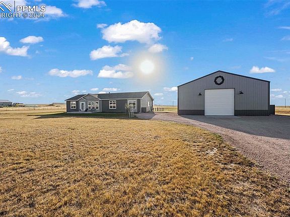 Beautiful, move-in ready, ranch-style home on 5 acres with a 10-car detached garage, offering endless possibilities for privacy, recreation, and development! Escape to your own private property where peace and quiet, campsites, and outdoor activities are at your doorstep. This home welcomes you with luxury vinyl plank flooring and an open, bright great room featuring a stone-surround fireplace as the main focal point. The eat-in kitchen is a cook’s delight, boasting granite counters, custom pendant lighting, a backsplash, a gas cooktop, and a pantry. In addition to the main living space, this home includes a separate living room, a primary suite with a five-piece bathroom, two secondary bedrooms, a full bathroom, and a laundry room with a utility sink. Step outside to the tranquil, covered patio and fenced area, perfect for your furry friends. The oversized 10-car detached garage, complete with RV parking and a convenient RV dump station connected to the septic system, is ideal for vehicle, boat, or RV storage. This garage features dual entry in the front and back with concrete flooring. There’s also an additional uncovered, fenced utility storage area next to the garage. Located between Castle Rock and Colorado Springs, this home offers easy access to the amenities of both cities while still providing the serenity of country living. Don’t miss out on this beautiful, move-in ready ranch home on 5 expansive acres!