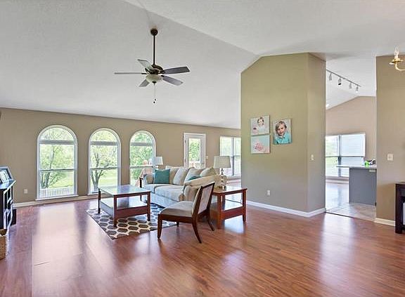Beautiful ranch in Sugar Creek Country! Spacious open floor plan with lots of natural light. Soaring vaulted ceilings throughout and large atrium windows that look out to the fenced in yard backing up to hole #2 of the golf course. The dining room has beautiful hardwood flooring and is open to the kitchen w/ custom two tone cabinetry, a tile backsplash and a breakfast bar island. The master bedroom features skylights, a ceiling fan and an ensuite bathroom with a whirlpool tub. Two more private bedrooms, a full hallway bathroom and a laundry room round out the main level. Downstairs, the finished basement offers even more space to relax and entertain. There is a full bar, large rec room, family room with a fireplace and a full bathroom. Walk out to the patio and enjoy a view that can't be beat! This lovely house has all you could need and more, make it your new home, today!