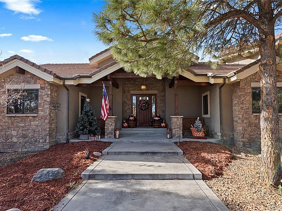 Experience elevated Rocky Mountain living in this stunning custom chalet on 6 acres with views from Pikes Peak to Wyoming, just 20 minutes south of Denver. Hand-troweled walls, vaulted/timber-beam ceilings, stone accents, custom cabinetry, and multiple fireplaces define the home. A great room opens to a gourmet kitchen with a sprawling island, premium appliances, Miele coffee station, pot filler, warming drawer, wine fridge, and above-cabinet lighting. Indoor/outdoor living on a maintenance-free deck, 3 main-floor suites (including a private primary with balcony, jetted tub, steam shower), an office, and remote-controlled blinds. A private suite above the garage has its own A/C/heat and 3/4 bath. The walk-out lower level includes a media area, rec/flex space, full bathroom, and roughed-in plumbing for future expansion. Outdoor amenities include multiple patios, putting green, low-maintenance turf, gas firepit, and an entertaining area with two ice makers, dishwasher, and mini fridge. Private gated entry, pond with timed irrigation, deer-friendly landscaping, lighting, security cameras, and RV access. Additional features: whole-house RO and filtration, two water heaters, dual A/C, high-speed WiFi, and a deep 3-car garage with Tesla charging. Also see the barn: 56x40 ft, 16 ft walls, 6/12 roof, snow guards, fire-rated drywall, 6-inch/4500 psi slab (12" for 2-post lift), 4-inch driveway with drainage, 225A to house, 200A to shop, office, lighting, air, dual 50-amp welder outlets, two 10x10 doors, 12x14 door, 8x8 roller door, septic pump, insulated shell, external water/propane at rear.
