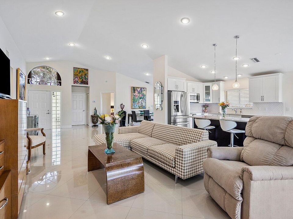 Gorgeous one-story home with peaceful water views from living room, kitchen and main bedroom. Beautiful large porcelain tile floors in main living areas and wood floors in bedrooms. Volume ceilings and open concept living, great for entertaining. Split bedrooms and laundry inside with full size washer and dryer. Brand new kitchen with quartz counter tops, shaker style kitchen cabinets and stainless-steel top of the line appliances. Accordion shutters throughout. Located in the prestigious man gated community of Boca Pointe with NO mandatory membership in a country club like community. Close to shopping, places of worship, top rated schools, beaches and all the fantastic things Boca has to offer. Call for a private showing!