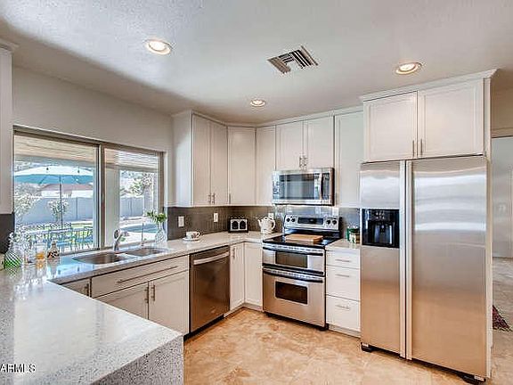 Nestled in a quiet mountain preserve enclave, this beautifully updated home is stylish and inviting. Newly remodeled kitchen with quartz-granite waterfall counter tops and stainless steel appliances, all overlooking the tranquil backyard. Solid knotty pine interior doors and travertine flooring throughout. Remodeled baths, newly added dry bar and upgraded light fixtures. Lush backyard with citrus trees and rose bushes, sparkling pool and therapy hot tub off the master. Mountain views in every direction and easy access to hiking trails. Wonderful neighborhood in close proximity to shopping and a quick hop onto Hwy 51.