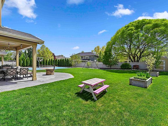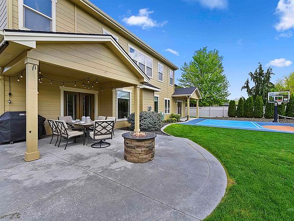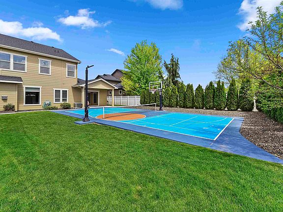 Space for everyone and everything on 1/3 acre lot in the most convenient Meridian location! Best of Bridgetower with this extremely popular and rarely available "Monaco" floorplan by Tahoe. Gorgeous master suite (up) plus secondary en-suite (main)! 6 BR + office + bonus + sitting room +hidden flex room off master for workout/den/nursery, etc. Storage galore with countless closets and a huge storage room behind laundry. 2 covered patios for entertaining + lg covered front porch! Custom 46x26 versatile night-lit sport court for pickleball, volleyball, basketball and more! New exterior paint and new carpet along with many other new appliances (see amenities list $68K), dedicated garden space w/15 boxes, 10x10 shed, built-out attic space w/lighting/flooring, garage overhead shelving, 6 fruit trees, side yard double-gate for parking ATVs, etc. Spacious gathering areas, large kitchen, huge walk-in pantry, oversized breakfast bar. All modern finishes with granite, SS appliances, gorgeous hardwood, tile and more!