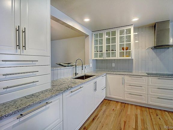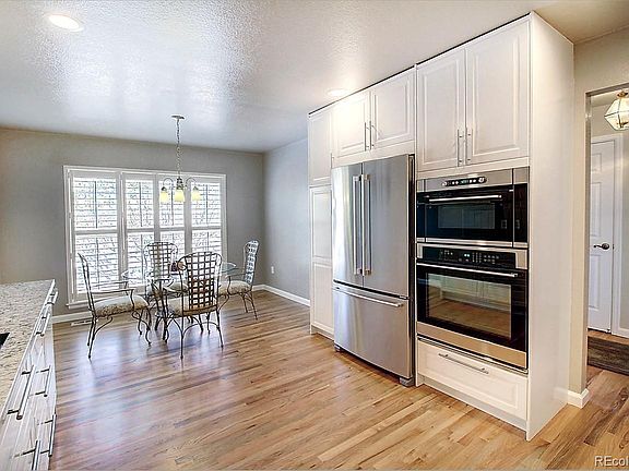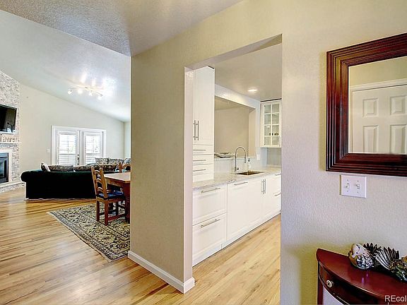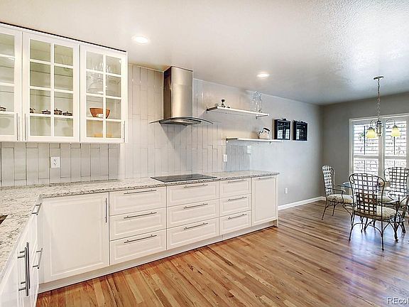 GORGEOUS 4 Bedroom, 3 Bathroom home walking distance to Cherry Creek Schools! Ranch-style home in the Trails at Saddle Rock Ridge, with finished garden-level basement, sits on an incredible, professionally-landscaped large lot. Main level has spacious open floor plan with newly refinished hardwood floors, plantation shutters, and 6-panel doors. and stunning remodeled eat-in Kitchen (2017). Kitchen features Quartz countertops, stainless-steel appliances, induction stove, hood vent, and decorative tile backsplash. Living Room fireplace has beautiful stacked stone from floor to ceiling. Master Bedroom has bay window, private 5-piece bathroom, and walk-in closet with built-in safe. Secondary bedrooms has custom built-in organizers. Basement has great natural light, and lots of built-in shelving for an office and/or kids' study area! Back yard is fenced, has garden area, lots of mature trees and landscaping. Brick paver patio and walkway to 2nd entertaining space with fire pit! Owned solar panels! New Class 4 hail-impact roof (2019). Tankless hot water heater.