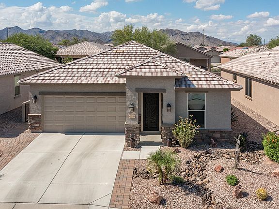 Spray foam home very energy efficient. Solar panels will be paid off at closing! This home features 2 bedrooms, an office, a smart space in the laundry room, and stunning upgrades. The kitchen has stainless steel appliances, granite countertops, upgraded cabinetry with pullout shelves, and an island breakfast bar. The great room is spacious and filled with natural light. You will love the shutters and upgraded ceiling fans! The Primary suite has a lavish ensuite with a dual sink vanity, huge super shower, and a walk-in closet. The backyard has been meticulously designed to enjoy serene AZ evenings with a large covered patio finished with pavers that extend out to an elevated seating area, all surrounded by mature Sonoran landscape. Beautiful home in Sundance, an amenity-rich active adult community!