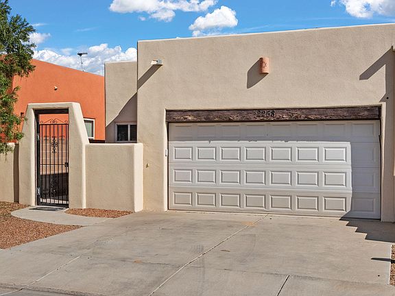 Gorgeous Pueblo style townhouse in a private gated community offering peace of mind and privacy for added comfort. The living room features an exquisite beamed tongue and groove ceiling, skylights, and a cozy gas log fireplace, while the kitchen delights with beautiful cabinetry, tile countertops, and easy flow into the dining area. Laminate flooring runs through the kitchen, dining room, and hallway, with tile in the bathrooms and soft carpet in the living room and bedrooms. The spacious primary suite boasts a double vanity, walk-in shower, and the second bath offers charming pocket doors. Additional highlights include 2 car garage, covered patio TPO roof (2020), BONUS* Tankless water heater!