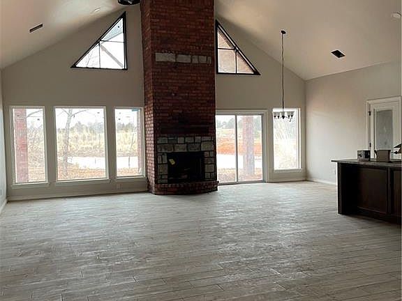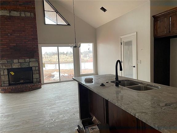 Beautiful high vaulted ceilings! pond front. 2 wood burning fireplaces, one inside and one out. Great covered outdoor patio.