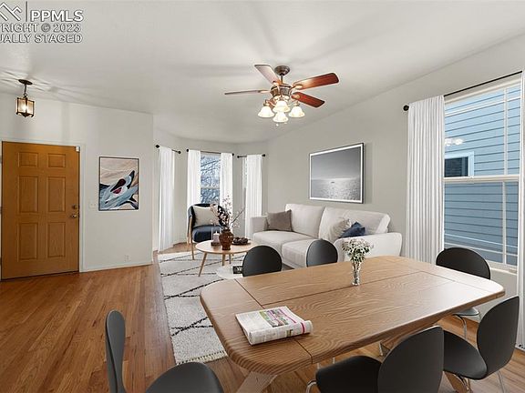 Welcome to this charming home in the fantastic Spring Creek community. Enjoy convenient access to Peterson AFB, Ft. Carson, downtown’s shops and new trendy restaurants, and just minutes to I-25 to easily get you anywhere you need. An added perk is having the local elementary school less than a 5-minute walk! Two beautiful mature trees and a covered front patio provide an inviting welcome home. Step inside to an open layout living room and dining room enhanced with beautiful hardwood floors and a pretty bay window that provides an abundance of natural light! The spacious eat-in kitchen boasts modern stainless steel appliances and plenty of countertop space, including a center island, for easy meal prep. Convenient laundry closet located in the kitchen with included washer and dryer! Open the door to the backyard and enjoy your private backyard with a nice white privacy fence, garden space, and stunning views of Pikes Peak. You’ll even get a front row seat to the annual Balloon Festival! Head upstairs to find the home’s 3 generous-sized bedrooms, including the primary retreat with spacious walk-in closet and private en-suite bath. Detached two car garage. This home is a must-see! Three virtually staged photos used in this listing.
