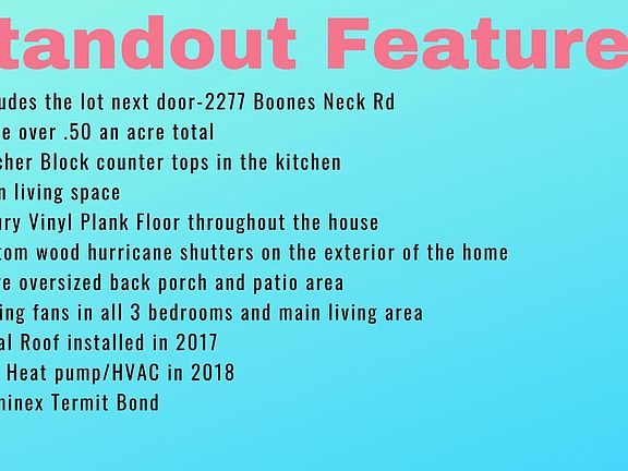 It is with great privilege to bring you 2259 Boones Neck Rd. Also known as my best friend's house! I have laughed in this house, I have cried in this house, I will always have some of the sweetest memories in this home! Now I have the honor of being able to hand the keys over to YOU, the next owner of this home. Where you will get to watch your kids and/or fur babies play around these two lots totaling .56 acre of property making sweet memories! Drinking your morning coffee or evening wine from the back deck enjoying life's moments. Whether your next chapter in life is downsizing, starting a family or just needing a beach getaway. This home fits all those needs. Less than 4 miles from sunset on Holden beach, to date nights at The Cove. You can leave all your beach chairs and toys in the storage shed out back where they will be waiting for your next visit!This home has so many farm style custom features waiting for you to add your personal style to. From the custom hurricane shutters on the exterior of the home to the beautiful warm luxury vinyl plank flooring throughout the house. This 3 bedroom 2 bathroom open floor plan has no carpet! You will enjoy the newly installed butcher block counter tops in the kitchen and bathrooms paired with white rectangle sinks. New metal roof installed in 2017 and HVAC installed in 2018! Do not miss your chance to see this cozy farm home! The lot to the right 2277 Boones Neck RD is included with the sale of this property.Do not forget about location! This home is a great location close to everything! Less than 7 miles from Novant Emergency room and Hospital. Less than 3 miles from shopping at your local grocery store, pharmacy, seafood market, and restaurants and mini golf! Owner is a licensed North Carolina real estate agent.