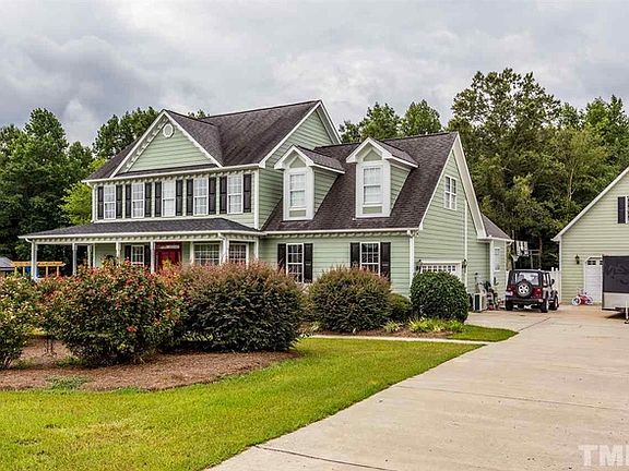 This home boasts class & privacy on an enormous 2+ acre wooded lot w/ in-ground SALT-WATER pool. Wrap-around porch welcomes w/ Southern Charm. 4 Car Gar includes 2 Car Detached Shop: finished, insulated, 220 volt power, & cable. Hardwoods on lower level. Gorgeous Kitchen: new granite counters w/ SS appliances. Elegant 1st floor Owner’s suite: Trey Ceilings, Hardwoods, & Tile Bath. Well+septic=no H2O bill. City H2O runs to property line. <1 mi. to new Novo Nordisk. Cruise to the Neuse GC on your golf cart