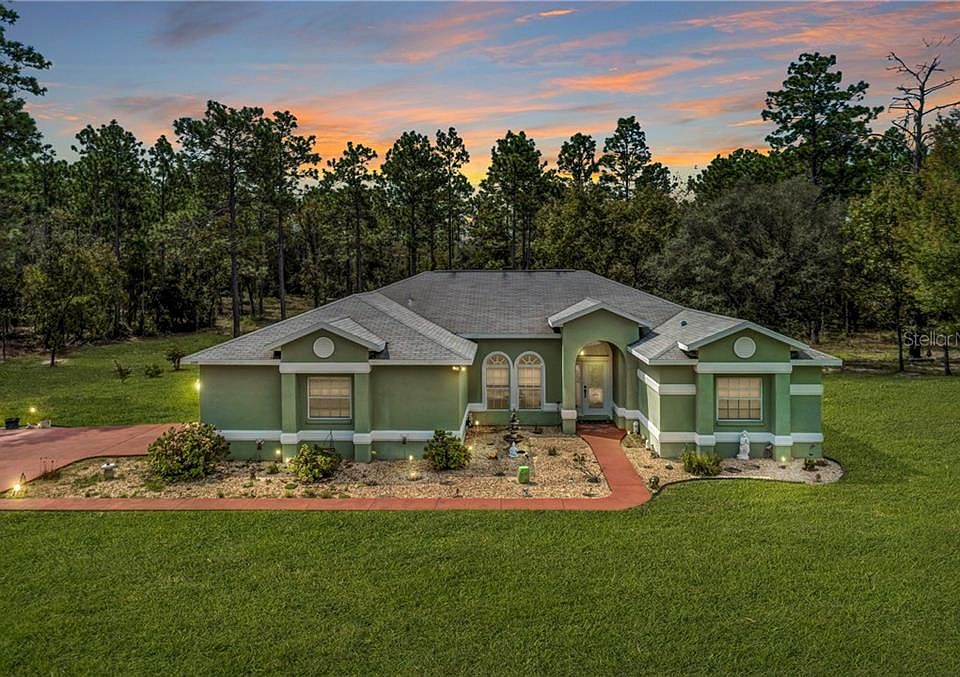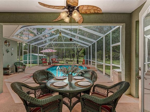 Looking for privacy and acreage? Bring all your toys, boats, RVs, and more. Look no further, this custom built home boasts 1.98 acres of land, a resort-style pool, 2468 s.f., 3 bedrooms, 2.5 bathrooms plus a den, formal living and dining as well as open concept family room kitchen and breakfast area. This home is beautifully nestled among gorgeous oak trees and preserve like vegetation. Block construction, low maintenance home. Walkthrough the entryway and you are welcomed by a large living room with a view of the pool, formal dining room, vaulted ceilings, and more. To the right of the entryway is the office with a murphy bed for an extra guest, and the master bedroom suite. This huge master bedroom has room for all your furniture and features a gorgeous view of the pool and the trees. The master bathroom features a large shower, double sinks, and a large walk-in closet. Walk to the other side of the home past the living room and you will enter the kitchen and open concept family room/breakfast room/kitchen area. The kitchen features a massive breakfast counter, walk-in pantry, and a view of the pool from the dinette. The additional 2 bedrooms are down the hall with a shared bathroom. The bedrooms are large and very spacious and airy. Head out to the great outdoors for a large pool with screened in lanai, covered patio area perfect for grilling and gathering. A 1/2 bath sits outside by the pool as well as an outdoor shower. There is a multiple storage shed in the backyard for extra items. The laundry room is next to the kitchen and features a sink and storage cabinetry. The Garage is an extra-large 2 car garage and sits at 22 x26. Easy to see, NO HOA, NO WATER BILL, NO SEWER BILL, INSTALL SOLAR AND YOU COULD LIVE OFF THE GRID. Almost 2 acres, 2nd acre may be able to be subdivided - check with county.