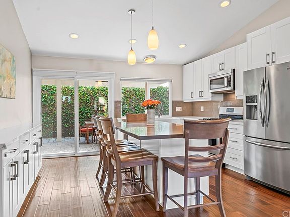 Lots of great upgrades with this 3 bedroom 2 bath Cul-de-sac home! Newer doors and windows, beautiful flooring, recessed lighting, neutral paint throughout. Living room has high ceilings and an amazing fireplace and a great room feel as it is open to the kitchen which has been completely remodeled with white shaker cabinetry and tile backsplash, stainless steel appliances, and a great island with plenty of seating. Master bedroom has a walk in closet with built in organizers, a remodeled master bath with dual sinks, a modern tiled walk-in shower. Solid covered aluminum patio with lighting and fan perfect for entertaining. Lowest priced home in the area with membership to the Sun & Sail Club with amazing amenities that include 4 pools, basketball court, volleyball, playground, tennis courts, inside workout room with view of the lake, locker room and more! Easy access to the 5/405 and toll roads.