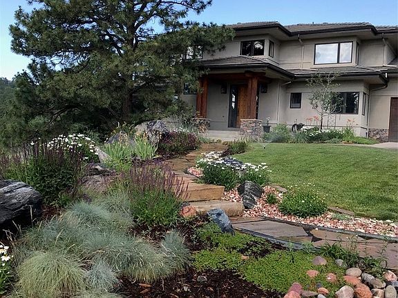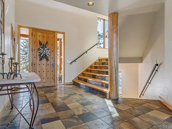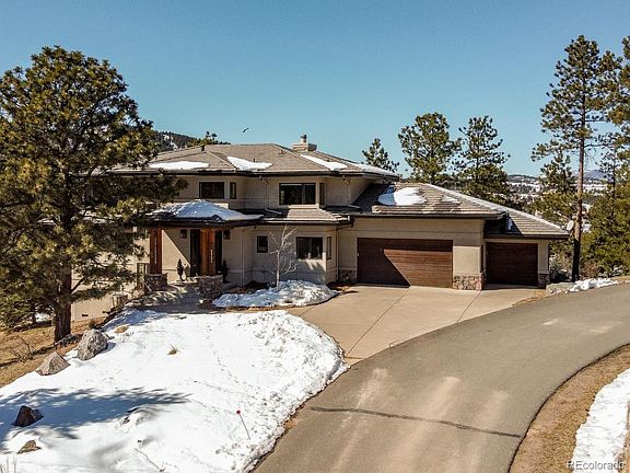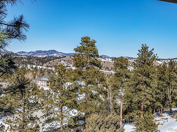 Everything about this home speaks luxury and good taste in a Colorado Contemporary setting. Add to that sweeping mountain views! It all starts with the Frank Lloyd Wright inspired design features such as the 90-degree corner windows in all corners of the home, large expanses of glass allowing the blending of outdoor space with indoor space, and an emphasis on organic architecture. The expanse of light in the home leaves a feeling of living in a tree house. Included are inlaid hardwood fox prints on the staircase from the basement family room up to the master bedroom, an 18-foot-tall wall of UV protected windows facing west to the Continental Divide, with remote controlled solar shades. This open floorplan is great for entertaining and family life as well. A gourmet kitchen features rare custom birds-eye maple cabinets with roll-outs. Abundant wildlife (elk, deer, turkey, fox, etc.) are common neighbors to enjoy in this setting. This location deep within the gated Riva Chase subdivision insulates the home from Interstate 70 noise, yet the highway is close by, and you are within 30 minutes of downtown Denver. To fully appreciate it, click on the virtual tour link to take a narrated video tour with the listing agent, including drone footage.