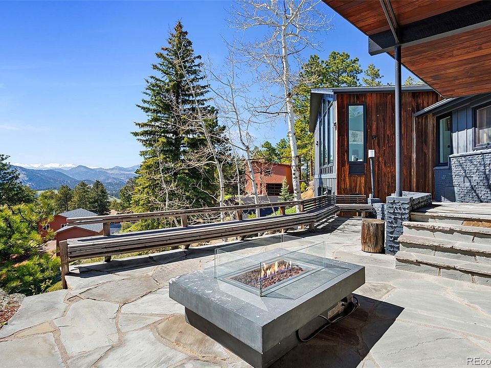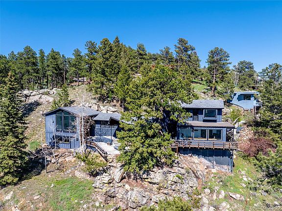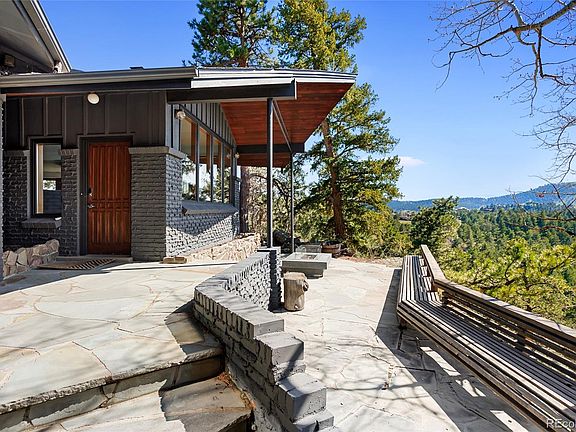 Set on an acre and a half on coveted Lookout Mountain, this stunning mid-century mountain retreat seamlessly blends architectural elegance with sweeping mountain views. Walls of windows flood the open living spaces with natural light, creating a seamless connection to the serene landscape with expansive views from nearly every room. The living room is anchored by a striking wood burning fireplace with floor to ceiling stone surround. The updated kitchen offers leathered granite countertops, stainless steel backsplash, original wood cabinetry and sleek appliances. The kitchen opens to the family room featuring a custom built-in entertainment center and storage, all opening up to panoramic views. Both living spaces provide access to the wraparound balcony and stone patio with fire pit. The luxurious primary retreat showcases soaring vaulted ceilings and majestic views that will have you wondering if you are waking up in a dream. Unwind in the large soaking tub, refresh in the tiled shower and enjoy dual vanities all with unique windows set against the privacy of rock outcroppings. Additional main level accommodations include a secondary bedroom, currently configured as a home office with built-in desk and shelving and a full bathroom. A curved staircase leads to the secondary suite with a spacious bedroom and five-piece bathroom with custom tile soaking tub and shower. Separate guest quarters feature a bedroom with built-ins and bathroom. A heated stone walkway leads to the oversized detached garage, complete with a newly installed electric car charger. Bonus room above the garage is perfect for a gym or workshop and offers a large storage room. Enjoy unparalleled peace and tranquility all with easy access to Golden, Denver, and ski resorts. With close proximity to Apex Park and scenic hiking trails, this extraordinary home offers the perfect blend of nature, luxury, and modern living. Don’t miss the opportunity to make this breathtaking mountain retreat your own.