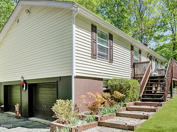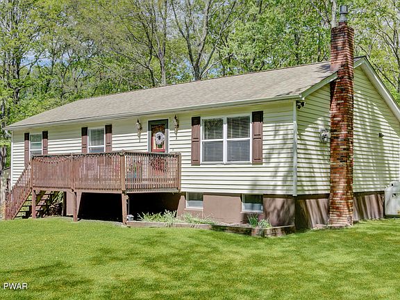 WELCOME TO THIS CHARMING AND WELL-MAINTAINED HOME SET ON OVER AN ACRE ALONG ONE OF THE MOST DESIRABLE ROADS WITHIN THE HIGHLY COVETED POCONO MOUNTAIN WOODLAND LAKES COMMUNITY. This inviting 3-bedroom, 2-bathroom residence offers a beautiful blend of warmth, comfort, and functional design--all surrounded by the natural beauty and tranquility of a private wooded setting. Inside, you'll find gleaming gunstock oak hardwood floors that flow throughout the main level, creating a cohesive and refined feel. The heart of the home is an open-concept kitchen and dining area, complete with Corian countertops, hardwood cabinetry, a large pantry, and a convenient eat-in breakfast bar. Sliding glass doors lead from the dining area to an expansive multi-tiered deck that offers abundant outdoor living space, complete with a hot tub connection already in place. The cozy living room features custom built-ins and a propane fireplace that adds both character and warmth. Chair rail molding and tasteful finishes throughout add to the home's timeless style. The primary suite offers a private retreat with an attached full bath featuring ceramic tile floors, a walk-in shower, and elegant cabinetry. Two additional bedrooms--nearly identical in size--offer comfortable spaces for family or guests, each with carpeted floors and ample closet space. The finished lower level is clad in rustic knotty pine and includes a spacious family room with vinyl flooring, ideal for movie nights, games, or entertaining. There's also a large unfinished storage area, a well-appointed laundry room with epoxy flooring, and a separate utility room. Outside, you'll find a private yard with two fire pits, a storage shed, and a two-car garage complete with a workshop area--perfect for hobbies or extra storage. With its prime location, thoughtful layout, and abundant indoor and outdoor living space, this property is an outstanding opportunity for those seeking a move-in ready home in a highly sought-after community.