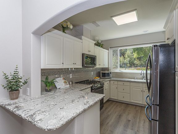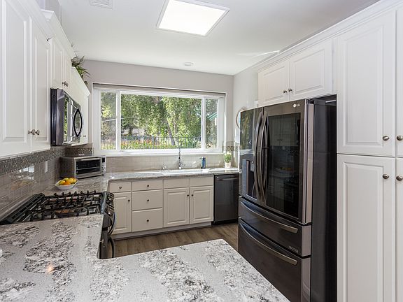 This home & it's location exudes perfection! Backs up to open forest & seasonal creek. Recently custom remodeled (200K spent) on luxury appointments. Main level living, 2 bedrooms upstairs & loft style office nook on the landing. Top of the line LG appliances, stackable w/d, luxury vinyl floors, quartz countertops, windows, fireplace, water filter system, LED lighting,& custom decor finishes throughout + plenty of storage. Backyard has pet friendly synthetic grass, pavers, awnings, 9X6 storage shed. (walk to the Mall, Costco & Trader Joe's) Gated neighborhood of 29 homes inspired by European architecture. Tranquil lamp-lit streets are tree lined with meticulously manicured lawns. HOA dues include weekly front yard landscaping.