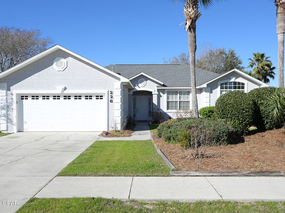 CURRENTLY UNDER CONTRACT, SELLER WILL CONSIDER BACKUP OFFERS'>>>> MILITARY FAMILY--REDUCED FOR QUICK SALE>>> BEAUTIFUL, LIKE NEW Stucco home, less than a mile to the gorgeous beach. 3 bedrm, 2 full baths. Fresh paint throughout, new carpet in bedrooms. New French doors to patio. Faucets, hardware, toilets all new. Wonderful open floorplan. Tons of natural light. Stunning Palladian window in guest room. Breakfast area & breakfast bar, plus formal dining. Fireplace. Most appliances less than 1.5 yrs old. Extra frig for garage. Pretty landscaping and fenced backyard for your furry friends. Great neighborhood with sidewalks and neighborhood pool. Close to beach and Pier Park. Perfect location. Come take a look and make this your new home at the beach. (home has TECO gas available, but off now. All measurements approximate. Please re-measure if important)