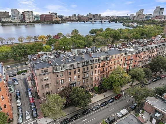 Introducing a premier townhouse opportunity on Waterside Beacon Street complete with spectacular Charles River views, elevator access to all floors and garage parking for 3 cars. This historic mansion, designed by the firm Snell and Gregerson in 1864, seamlessly blends magnificent architectural detail with modern updates. Outstanding features include ornate moldings and decorative plasterwork throughout, seven fireplaces and soaring ceiling heights in the sun-filled rooms. Enter the main floor boasting a Great Room with access to an expansive deck overlooking the lagoon on the Charles, perfect for entertaining. One floor above is an eat-in kitchen and an adjacent dining room showcasing exquisite period detail. The third floor is dedicated to the primary suite complete with a luxurious, renovated bath. The lower level features a home gym with full bath, an au-pair/guest suite with kitchen and direct access to the garage. Exceptional location close to all that Back Bay has to offer.